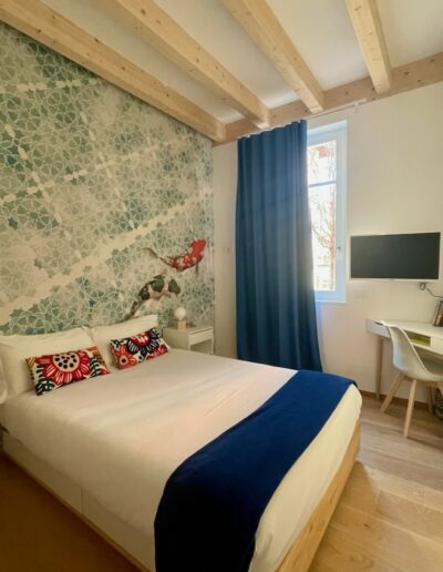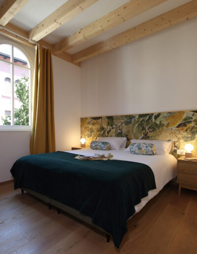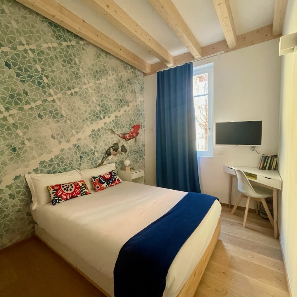 Gli ambienti, luminosi e arredati con gusto contemporaneo, combinano eleganza e praticità. Le camere sono dotate di letti confortevoli, matrimoniali o singoli, con biancheria di alta qualità, armadi spaziosi e dettagli curati che creano un’atmosfera accogliente e raffinata. Il bagno, ampio e ben attrezzato, dispone di doccia o vasca, asciugacapelli e set di cortesia.