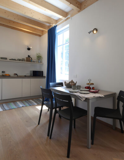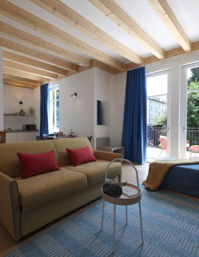 Dotati di un comodo angolo cottura completamente attrezzato, i monolocali permettono di preparare pasti in totale libertà, grazie alla presenza di piano cottura, frigorifero, utensili e stoviglie. L’area notte, con divano letto matrimoniale e letto aggiuntivo, è arredata con gusto contemporaneo e materiali di qualità, creando un’atmosfera rilassante e raffinata.